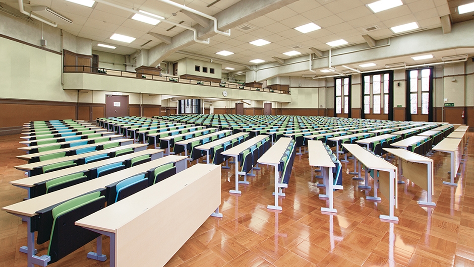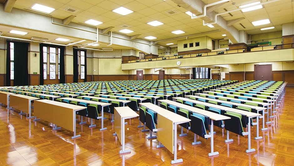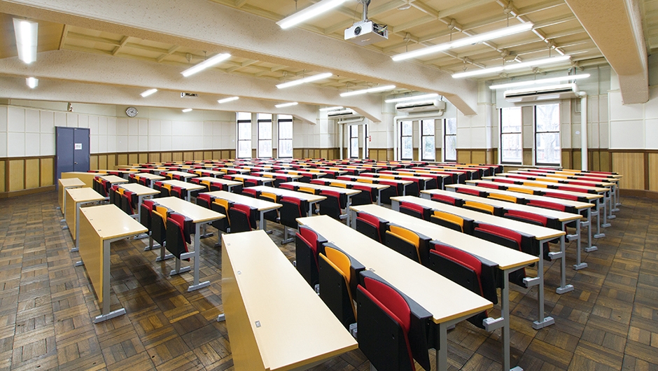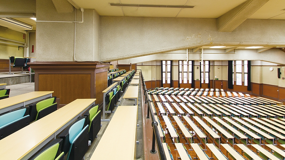 東京大学法学部の歴史ある建物の外形は活かしつつ、内装や家具をリニューアルすることで学習環境の向上が図られました。キャンパス内に700名以上収容できる教室が2部屋(25番教室・31番教室)あるのが特徴で、同等規模の教室を有する施設は数少ないため、センター試験などの試験会場として度々利用されます。31番教室は、試験時に1階席のみ使用で、1席おきに着席しても最大424名収容可能。また、床タイルの張替えも実施され、空間が明るくリフレッシュしました。