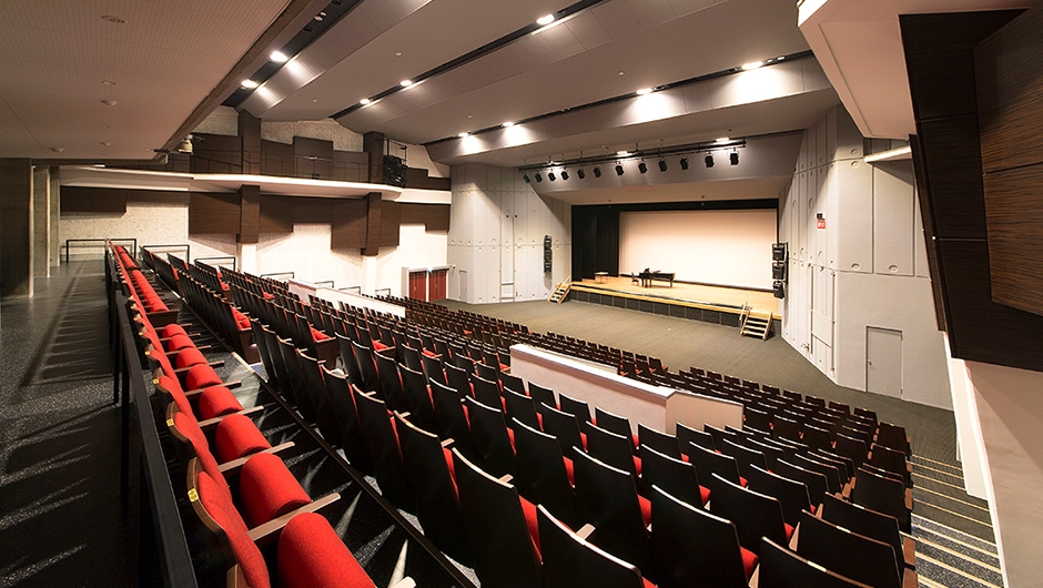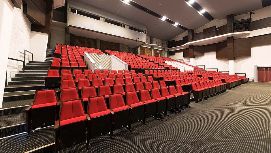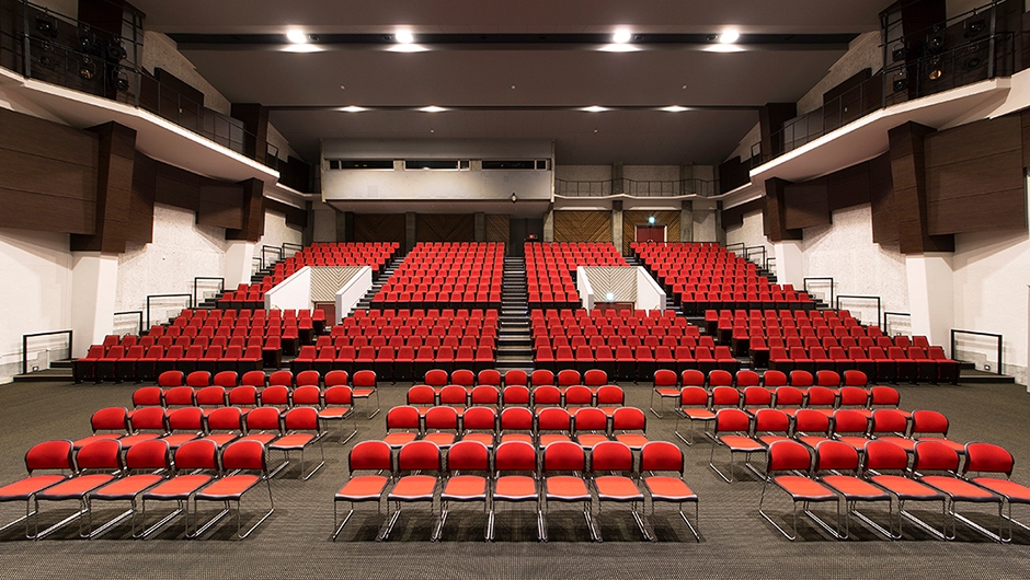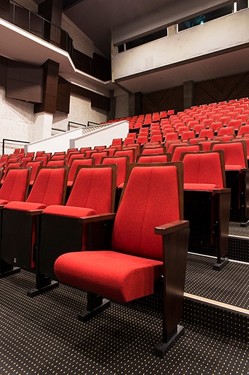 ホールは、多目的利用に対応可能な平場部分の平土間式はそのままに、内装と客席のリニューアルが行われました。客席は、ゆったりとした座り心地を確保するために、改修前より席数を減らして1人当りの座席幅を450mmから490mmへ拡大。さらに肘の形状を奥から手前に向かって細くすることにより、ゆとりをもって着座へアプローチできるよう工夫されています。
