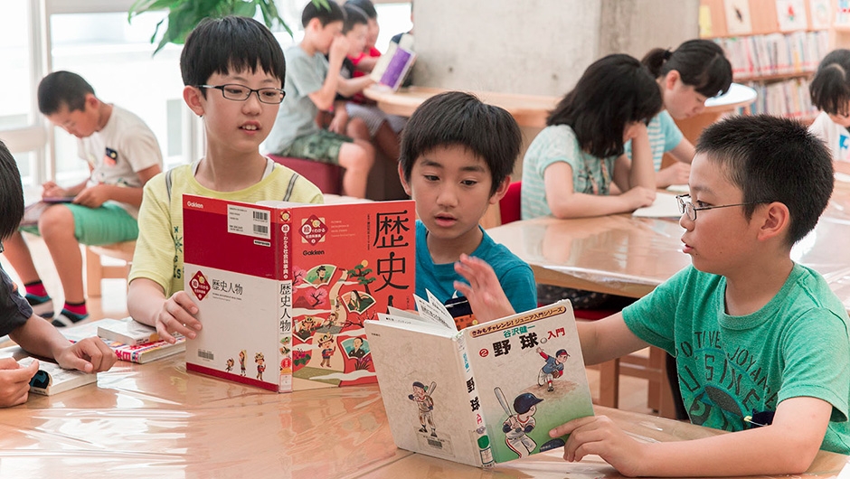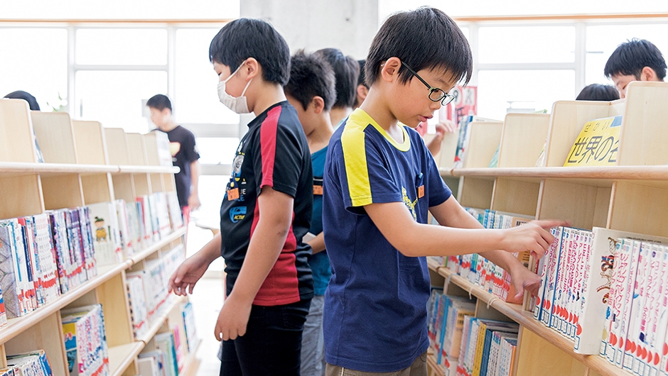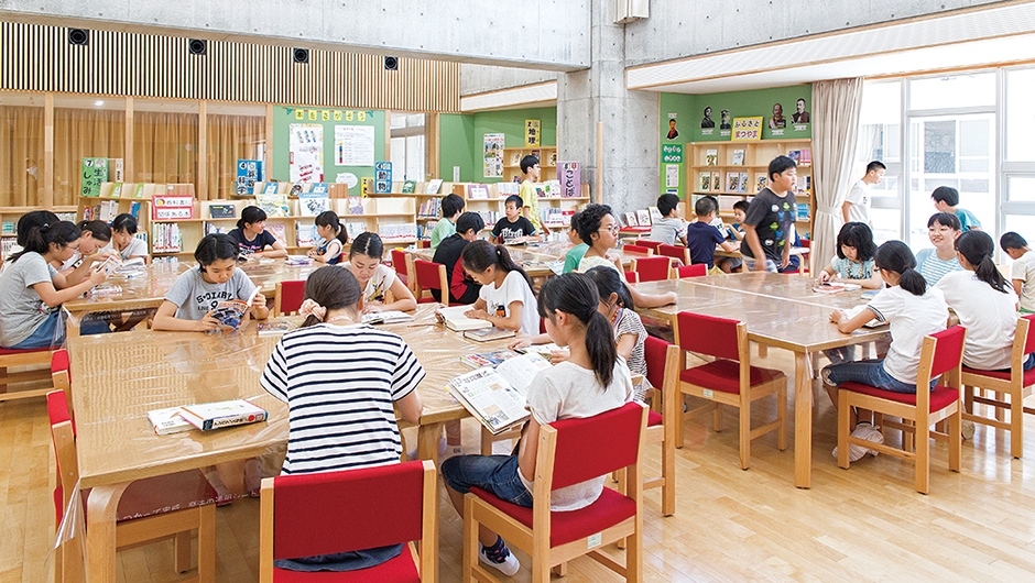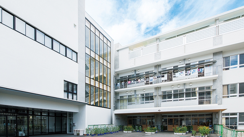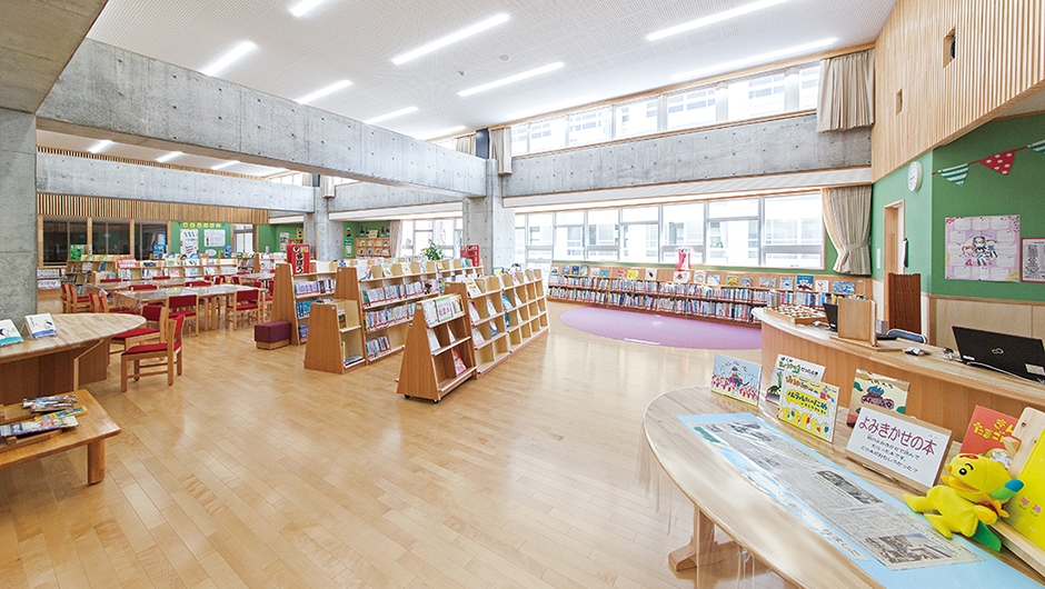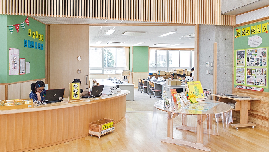 東雲小学校は、改修が行われた東中学校と新設された教育研修センターとの間に位置し、両施設から渡り廊下で接続できます。新校舎は4階建てで、メディアセンター(図書室)は、どの教室からもアクセスしやすいよう2階の中央部に配置。また、メディアセンター(図書室)から直接PC教室へ入ることができ、調べ学習などで相互に活用されます。