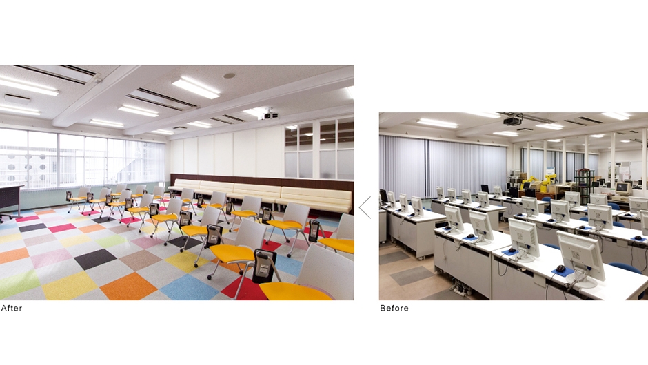 コミュニケーションラボ・アクティブルーム/タブレット付イス:デューン、プロジェクター、スクリーン、ホワイトボード塗装、内装工事(床・壁面)