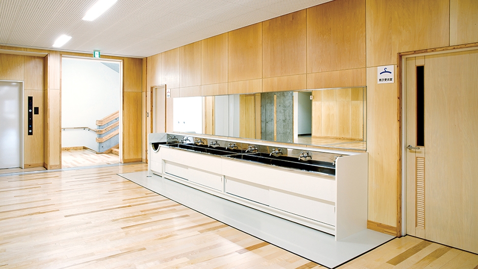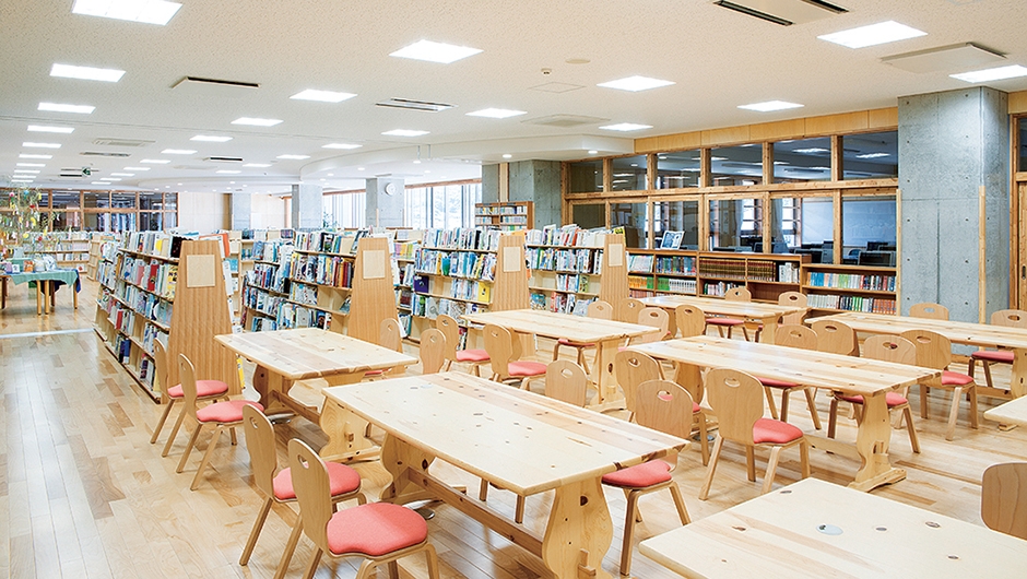 小・中連携教育を軸とした空間計画がなされ、全生徒が共用する施設のひとつである図書館は、異学年の交流を促す重要な役割を持ちます。図書館のレイアウトプランや家具は、「平湯モデル」が導入されました。