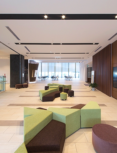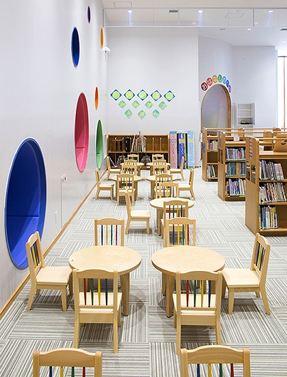 2015年10月、こどもプラザ・男女共同参画センター・図書館・コミュニティセンターの機能を併せ持った複合施設として開館しました。人づくり・人のつながりづくりを目指し、地域コミュニティ再生につなげるための新たな交流の場を設けています。各空間に配置したテーブルの多くはキャスター付なので、レイアウト変更が容易に行え、多様な交流スタイルに対応できます。多目的ホールの壁面には、西脇市の地場産業である播州織(ばんしゅうおり)のタペストリーがあしらわれています。