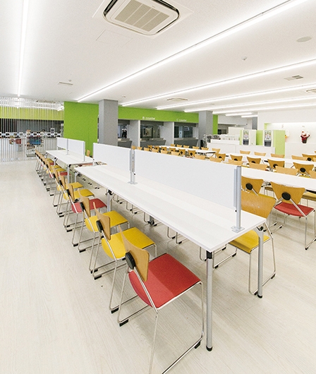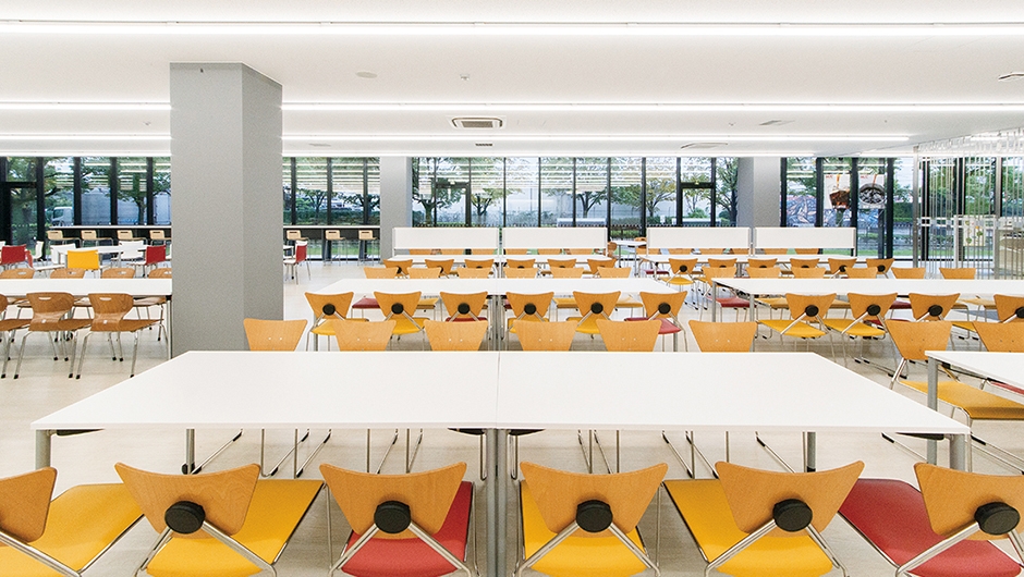 2016年に迎える創立60周年に合わせ、キャンパスの新たなシンボルとして「FLOS(フロース)館」が建設されました。FLOSはラテン語で花を意味し、今後も学園が花開き発展していくようにという願いが込められています。館内には、健康栄養学科が実践の場として活用していく学生食堂やフードビジネス学科の実習室、情報メディア学科のメディアラボや撮影スタジオなどが配置され、全学科の学生が利用する施設となっています。