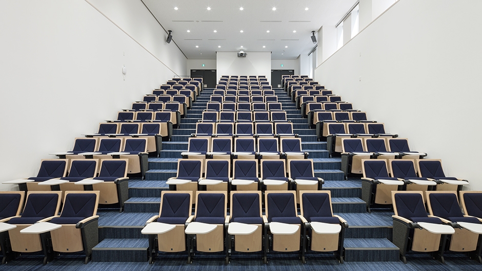 2015年に新築された、材料科学分野の新たな研究拠点施設です。 1階レクチャーホールは129名を収容し、国内外の研究者の交流や会議などに利用されます。ステージから見て左側3列は、座席幅を560mmに拡張して体格の良い外国人でもゆったりと利用できるよう配慮されています。(その他の座席幅は520mm)また、客席には収納式の大型タブレットを装備しているため、会議時にPCを置いたり筆記をすることが可能です。