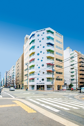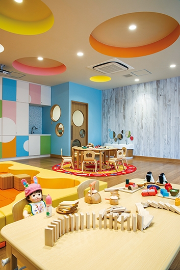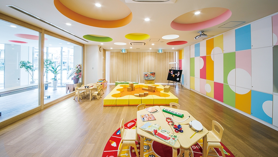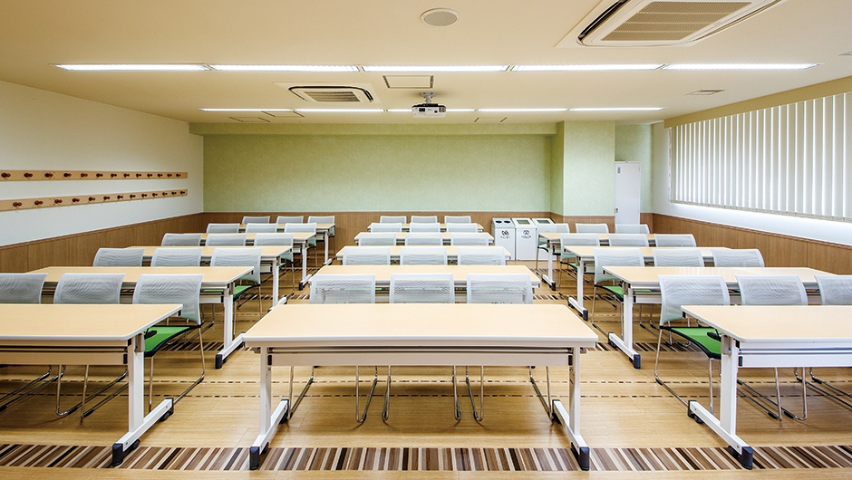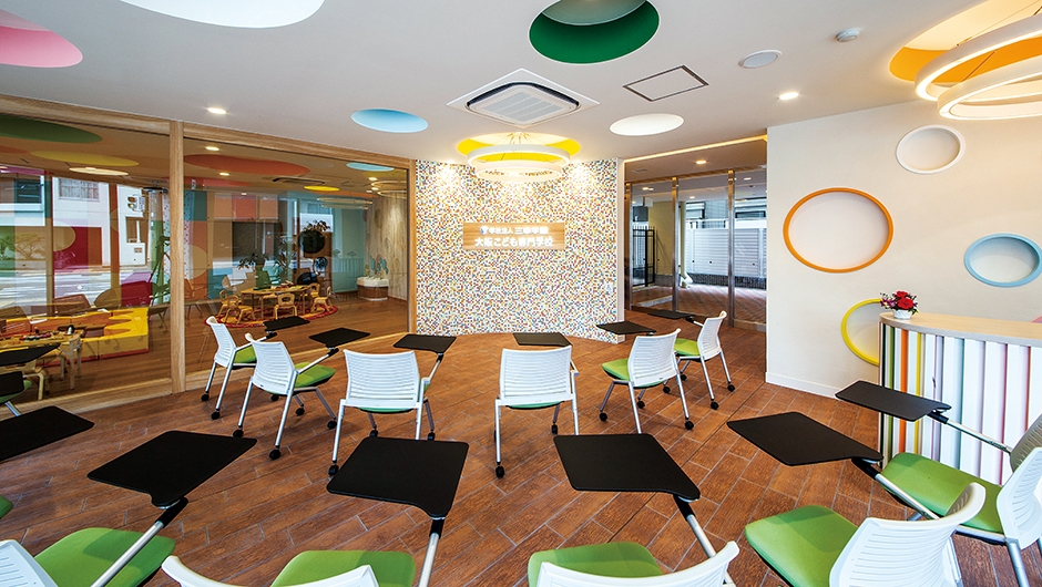 2015年4月、校舎移転に伴い新校舎が建設されました。木のぬくもりが感じられるイス・テーブル、パステルカラーを配したベンチマットや玩具にいたるまで、こどもの保育と教育の人材育成にふさわしい明るい空間づくりをしています。1階エントランスには、収納性が高いタブレット付イスを採用。オープンキャンパスなどの催しの際は、筆記のできるイスとして配置し、使用しない時はコンパクトに収納できるため、空間の多目的利用が可能となっています。