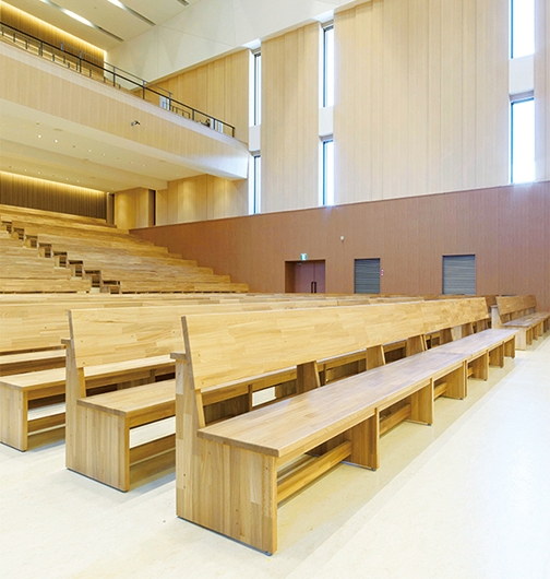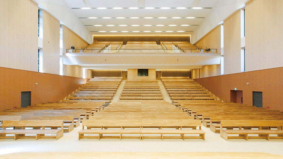 2011年に迎えた創立120周年を記念して中学校・高等学校の建て替えが計画され、2015年に校舎棟、2016年に体育館棟が完成しました。校舎棟の中央には、キリスト教教育の拠点となる礼拝堂が配置され、毎朝礼拝を行う全校生徒を収容できる座席数を確保。礼拝堂という神聖で凛とした空間でありながら、ナチュラルカラーの木製ベンチがぬくもりのある雰囲気を演出し、生徒や教員を穏やかに迎え入れます。