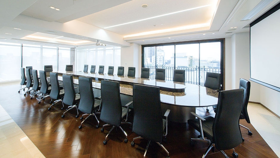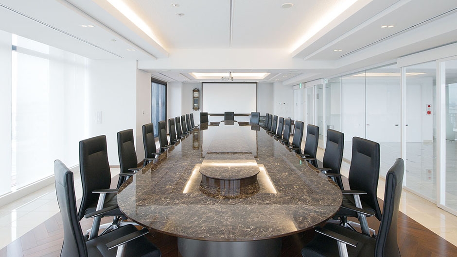 カスタマーセンターを設けるため、新たに社屋が建設されました。大会議室のテーブル天板は、部屋内にある大理石貼の柱と意匠を合わせ、高級感のあるデザインとなっています。また、テーブル中央部分には、スライドカバー式のACコンセントを装備し、PC利用などに対応しています。