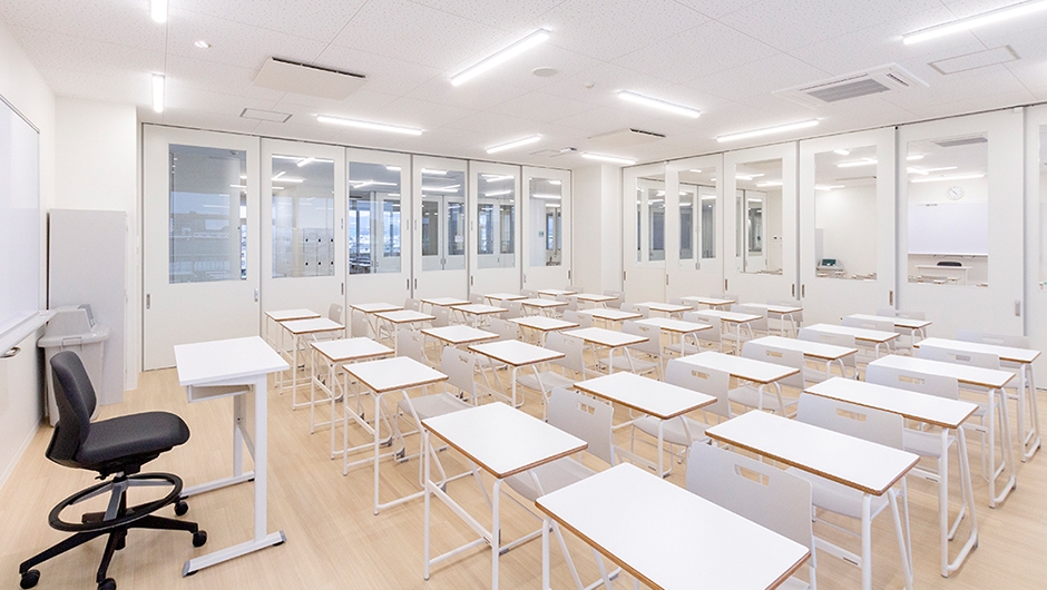 新校舎では、校舎内全てを学びの場と位置付け、いつでもどこでも学びが展開できるよう一つの空間を自在に間仕切りできるようにし、机・イスなどの家具も全て可動式にしています。これにより、扉を開放すれば複数クラスが合同で学べる一体的な空間となり、扉を閉じればグループ学習や個別学習にも対応。学びの形態が多様にアレンジできることで、生徒主体の「学びあい・教えあい」が促進されることが期待されています。