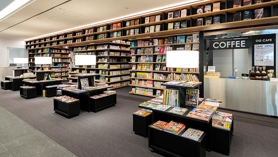 1階 OG CAFE/書架:造作家具、展示台:特注品