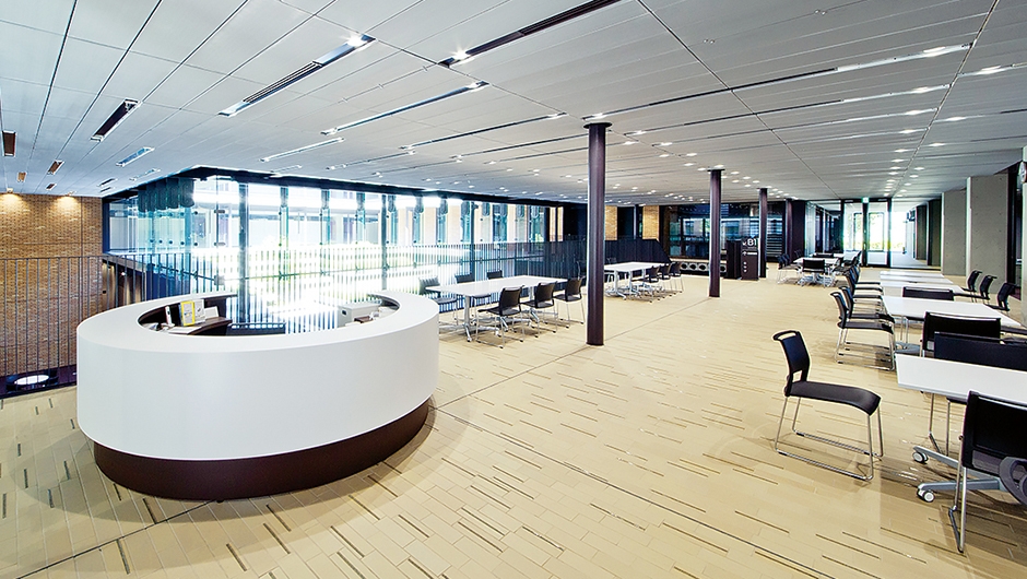 関西外国語大学中宮キャンパスの7号館は、中・長期ビジョン「関西外大ルネサンス2009」の第3期整備計画として、2013年に建設されました。目的は、“少人数授業の増加を始めとする教育内容の充実”と“学生がより満足できる就職サポートの実現”のための環境づくりです。