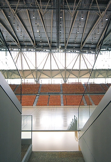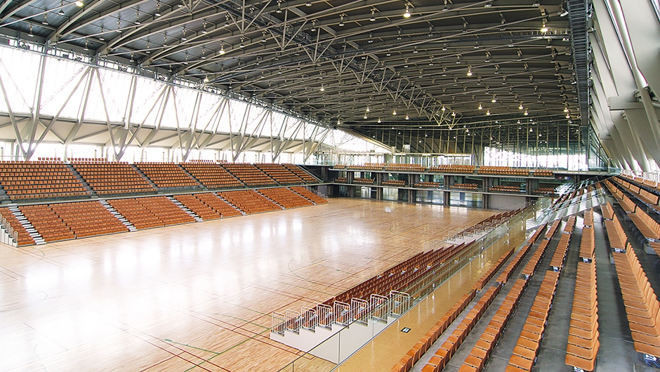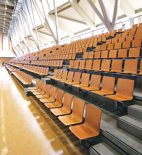 2008年4月にオープンした「いしかわ総合スポーツセンター」は、石川県におけるスポーツ振興の拠点施設です。日本海側では最大級のメインアリーナを備え、県民の活用とアスリートの育成を目指します。アリーナを単に競技をするだけの場とはとらえず、空間にやわらかいイメージを持たせるため、内壁と客席に木の素材を使用。移動観覧席の座にも木を使い、収納時にはかま部分が壁面仕上げとなることを想定して検討されました。メインアリーナでは、仮設を含め6,000人収容という条件があり、固定席が約2,800席、移動観覧席は2,152席とし、そのうちの744席を完全移動型としました。すべての移動観覧席を壁内収納型とするには、メインアリーナの壁面量が足りないため、完全移動型にすることでサブアリーナにも収納。両アリーナでの完全移動型観覧席の共有使用により、サブアリーナでの1,000人のイベントを可能にしました。