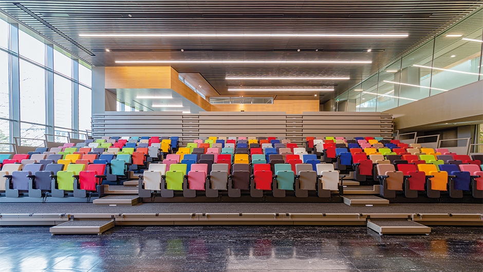 2021年3月、中央大学 多摩キャンパスに新しい学びの空間「FOREST GATEWAY CHUO」が竣工しました。講義室、演習室のほか、アカデミックライティングラボ、劇場型プレゼンスペースなど多様な学修環境を備え、学生や企業、地域の人々の交流拠点として、あらゆる「知」が集合・発信される空間となっています。また、ホールの移動観覧席は特定の色の座席に座ることでソーシャルディスタンスを保てる工夫が施されています。