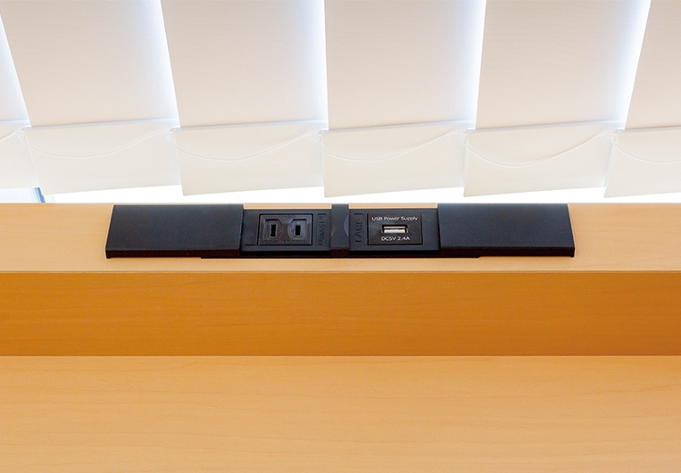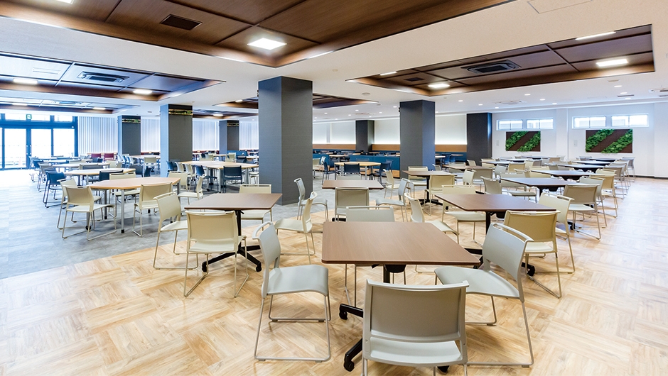 2号館には学生生活を送るうえで欠かせない各種施設が揃っており、1階の食堂には、グループエリアやカウンターエリアなど、利用者のニーズに応えられる様々な席が用意されているほか、カウンターテーブルにはコンセント(AC+USB)が装備されており、個人学習スペースとしても活用できます。