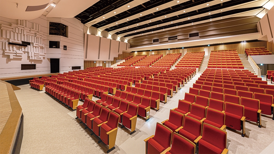 開館から50年近くが経過し、施設の老朽化が進んでいた中津川文化会館で改修工事が実施され、2020年12月にリニューアルオープンしました。改修工事ではホール内の特定天井の耐震化工事、バリアフリー化のほか、客席の更新を行いました。更新に伴い、客席の幅は改修前より50mm広げ、ゆったりとした座り心地となったほか、中央の座席は千鳥配置にすることでステージが見やすくなり、快適に鑑賞できるホールへと生まれ変わりました。