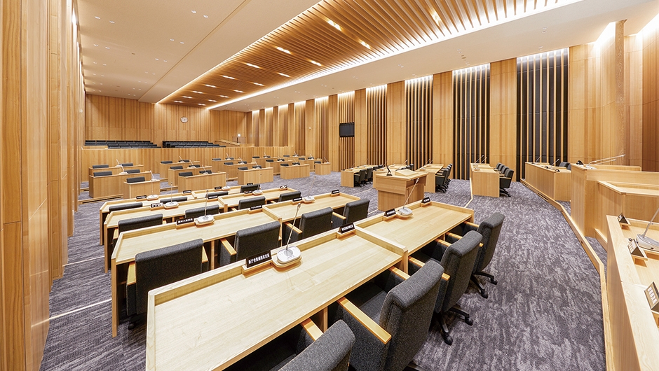 6階 議場/議場イス:RC-2200W、傍聴席:ミンゴα、議場イス:RC-2200W、記者席:SCF-5105C