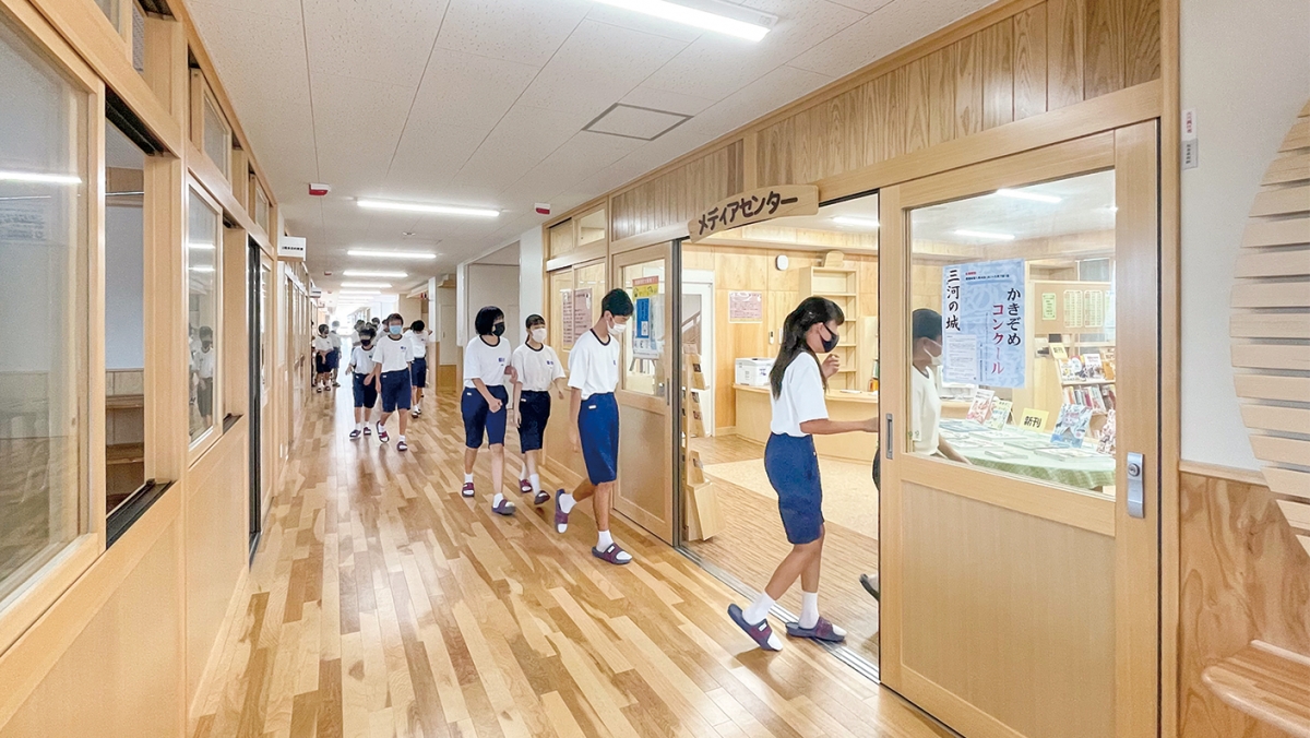 豊田市では豊田市子ども読書活動アクションプランに基づき、「読書に親しむ機会」とともに、「本の活用能力を身に付ける機会」の創出を目指し、学校図書館における調べ学習の充実を目指しています。2021年春に完成した新校舎のメディアセンターは、2階から3階にまたがっており、多くのクラスルームからアクセスがしやすくなっています。また木質系の内装でまとめられた広い館内には、充実した蔵書と、2クラス分の調べ学習のエリアが設けられており、本に親しむための優しい雰囲気と、学習に必要な機能を両立しています。