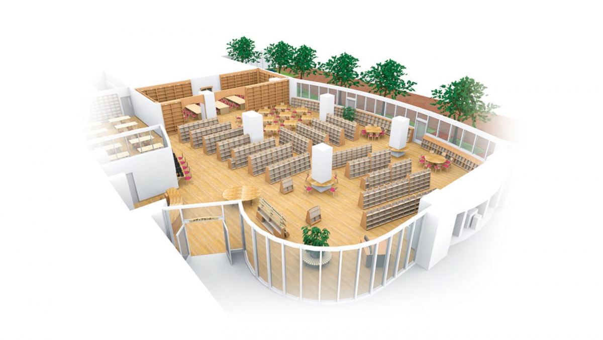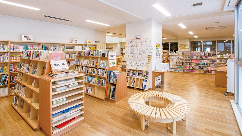 校舎の建て替えに伴い一新された図書室は、光庭に面した、吹き抜けからの光が取り入れられた明るい空間になっています。また、平湯モデルが採用されており、木の温もりを感じることができる図書室へと生まれ変わりました。