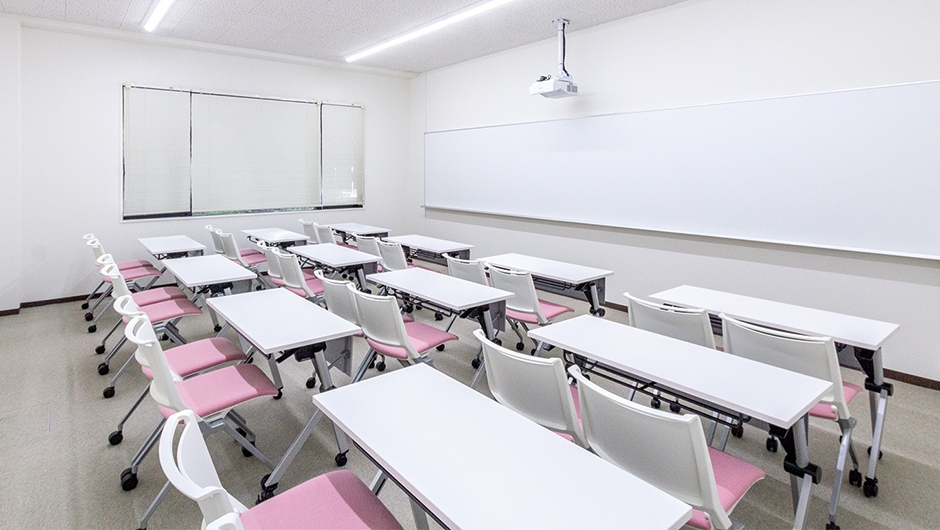 1階 教室/イス:ルッシュ、デスク:タクト、教卓、黒板(映写兼用移動ホワイトボード付)