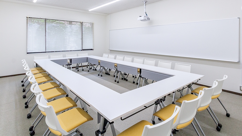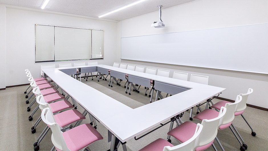 1階 演習室/イス:ティーポ、テーブル:フリプト、映写兼用ホワイトボード、プロジェクター