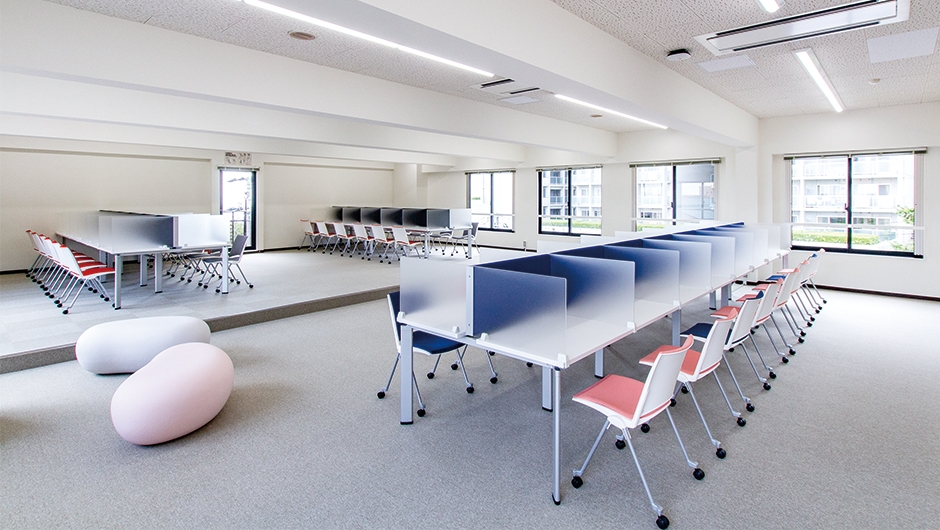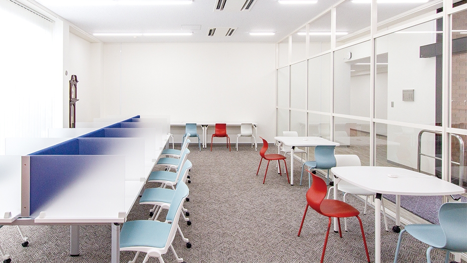 神戸松蔭女子学院大学では実践的能力を身につける教育環境の充実を目指し、自習スペースの増設をはじめ、普通教室のICT機器の整備、アクティブ・ラーニング対応教室の整備を進めています。7号館では、PC使用を前提とした自習スペースと演習室の改修がなされ、プロジェクターの設置・改修、可動イス・デスクへの入れ替えが実施されたほか、卓上でAC電源が使用できるように整備されました。明るく生まれ変わった自習スペースは、リモート授業や面談など多目的に使用されているほか、学生が授業の合間を過ごすスペースとしても活用されています。