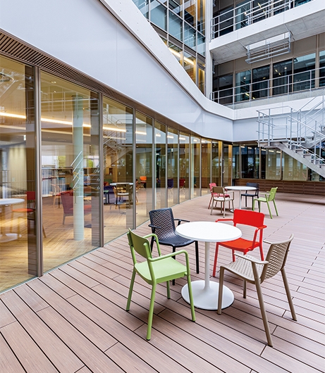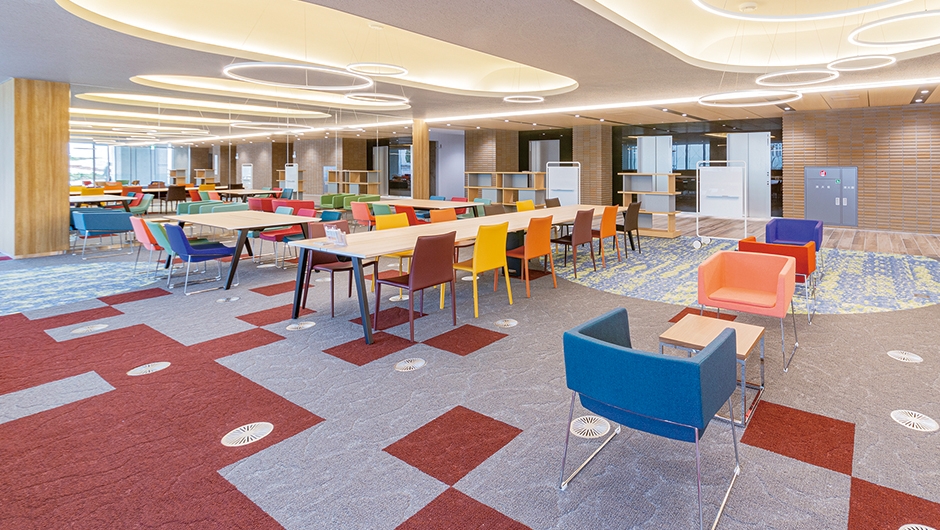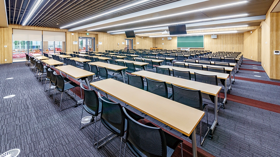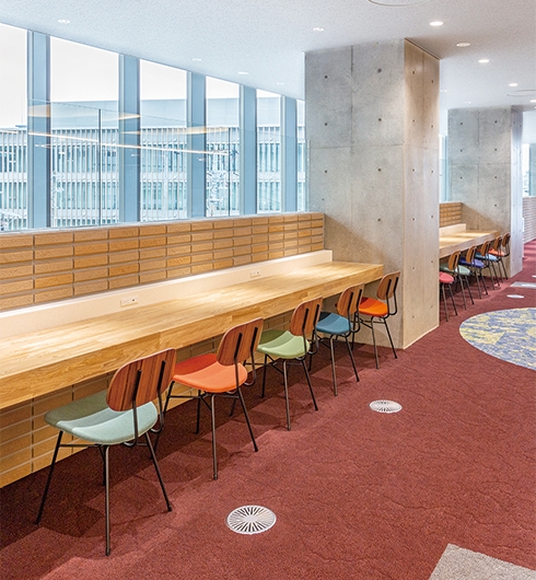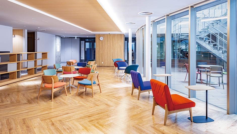 研究実験棟Ⅳには、理工学部の研究室・実験室・演習室のほか、低層階にはキャンパスアプローチに面する学生ホールや開放的なラーニングコモンズ、全学共用の講義室が設置されています。広がり感のある天井デザイン、ウッドデッキや磁器質タイルなど、利用者が居心地の良さを感じられる空間となっています。