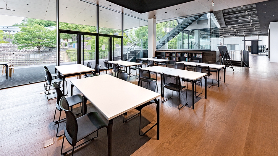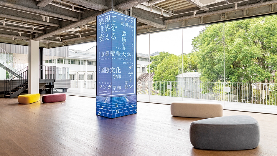 新校舎には、講演会やイベントに使用できるメインホールや、大型ギャラリー、ギャラリーと連動したワークショップや講座などでも利用できるアクティビティコモンズ、学内での国際交流を促進するグローバルラウンジなどが開設され、学生たちが異文化に触れ、楽しみながら新しい価値観を学べる、京都精華大学の中心的施設として期待されています。