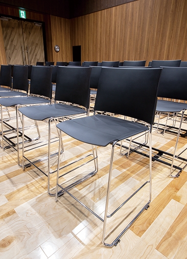 客席にはスタッキングチェアが採用されており、コンサート開催時にはイスを床に固定して利用。後列になるにつれて座面高の高いイスが配置され、後ろの客席でも十分な視界が確保されています。またステージから観客の距離が近く、奏者の息遣いを感じることができるホールとなっています。