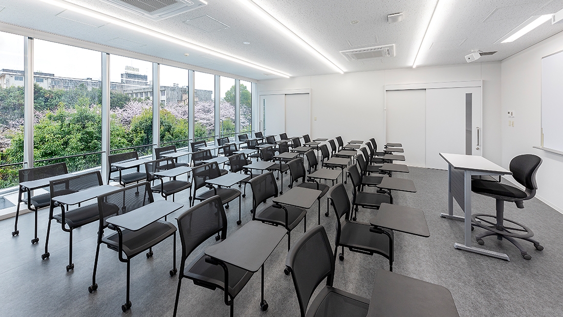 教室棟の内装は過度な装飾は避け、モノトーンを基調としたスタイリッシュなデザインになっており、学生一人ひとりが創意工夫して活用できるフレキシブルな空間で、主体的な学修姿勢やメンタリティを培うことができる学びの場となっています。