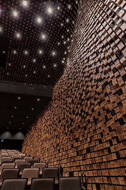 1,505席の大ホール「トリシマホール」は、プロの公演にも対応できる高機能ホールで、スギ材のキューブを張り巡らせた迫力ある壁面、デザインだけでなく音響面でも高い効果を発揮する設計となっており、歌舞伎、ミュージカル、バレエなど本格的な催しが開催することができます。
