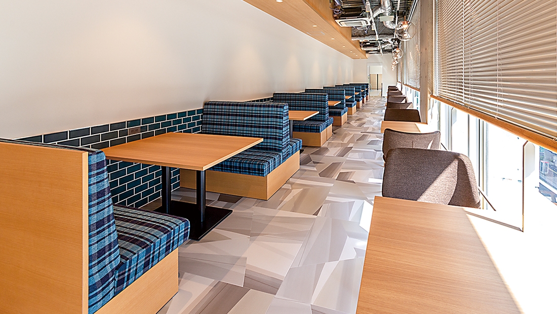 リニューアルした食堂は、空のイメージであるブルーをアクセントカラーとし、内装には木目調や植栽を取り入れた落ち着いた空間となっています。明るく開放感のある食事スペースをはじめ、屋外にいるようなアウトドアラウンジ、グループで利用可能なソファラウンジ、1人でも利用しやすいカフェカウンターやカフェブースなど、学生のさまざまなニーズに応えられる食堂へと生まれ変わりました。