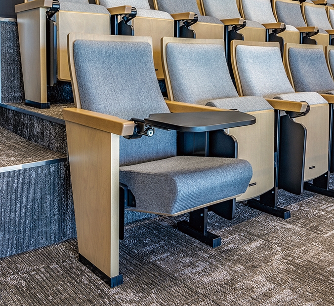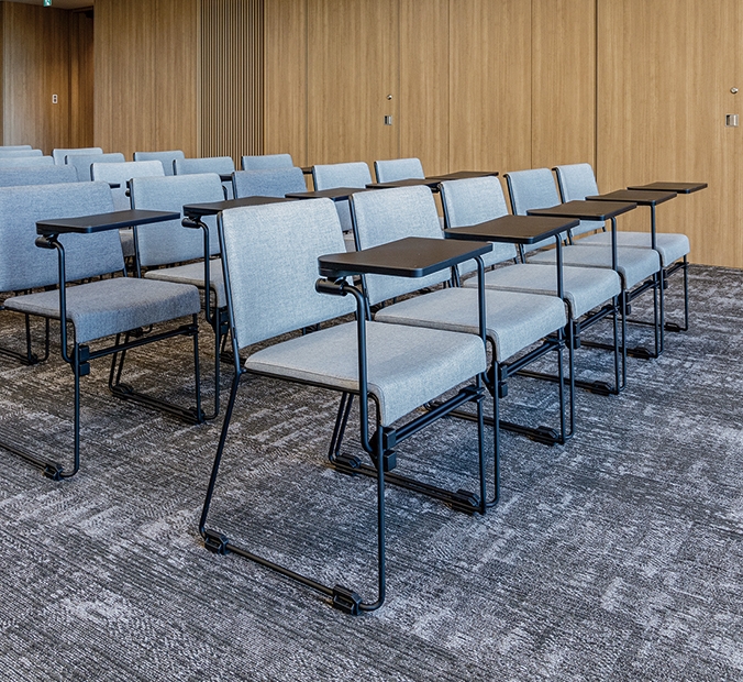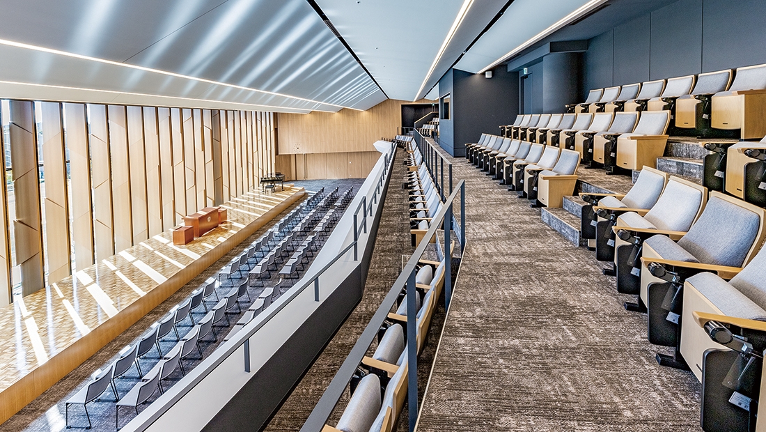 公園に面したガーデンウィングにある収容人数600名の「TIUホール」には、タブレットが装備されている固定イスのほか、タブレット装着可能な可動イスが採用されており、多目的に利用することができます。また、壁面には表裏それぞれの面に吸音と反射の機能を持った木調パネルの回転ルーバーが採用されており、催しの内容に応じて開閉することができます。
