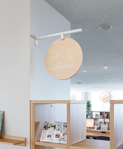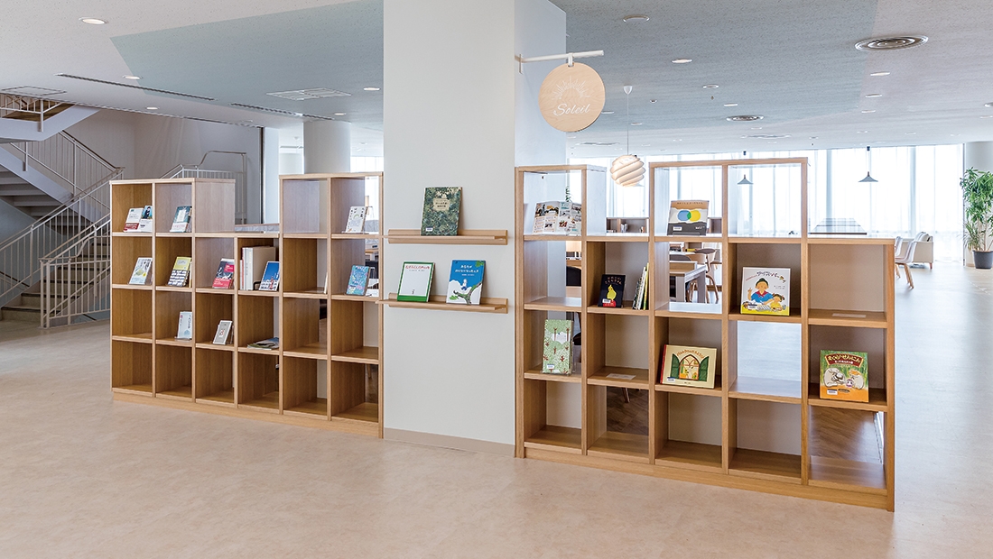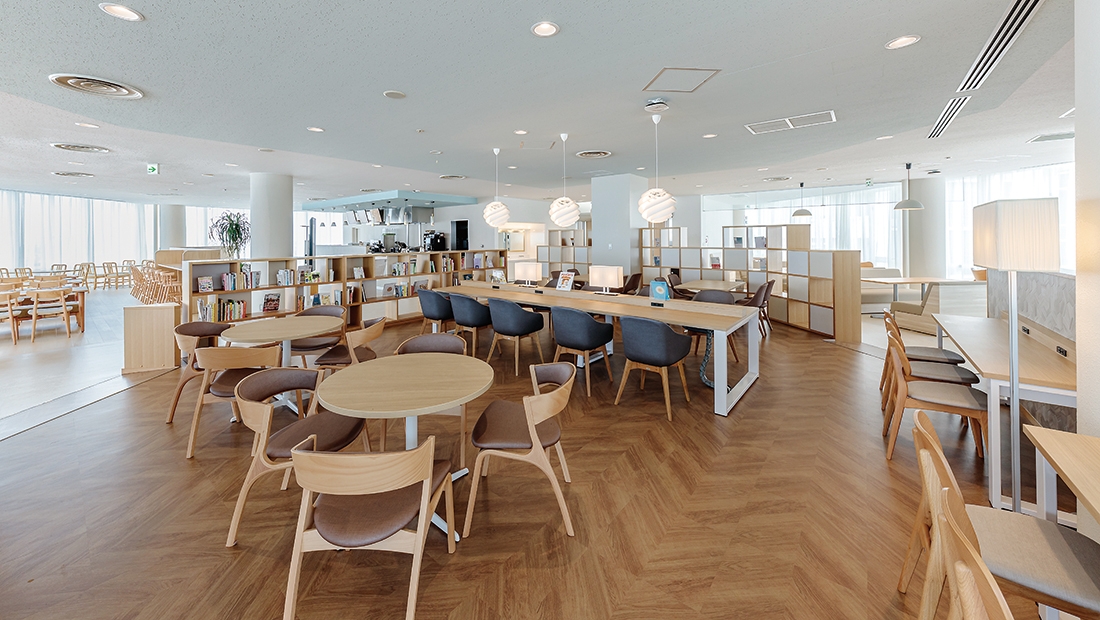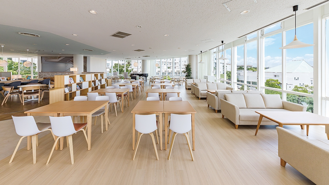 学生からの「おしゃれなカフェをつくってほしい」という要望を受け完成したカフェは、書架に囲まれ、本を読みながら飲食できる「ブックカフェエリア」や、大人数で座れる席やゆったりくつろげるソファ席を配置し、仲間同士で会話を楽しんだり、イベントにも活用できる「コミュニケーションエリア」など、「学び、交流し、考える」のコンセプトに基づいたゾーニングがなされています。