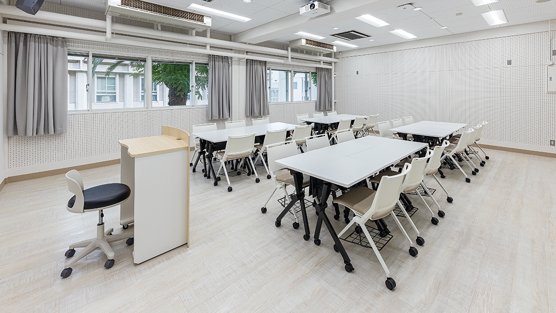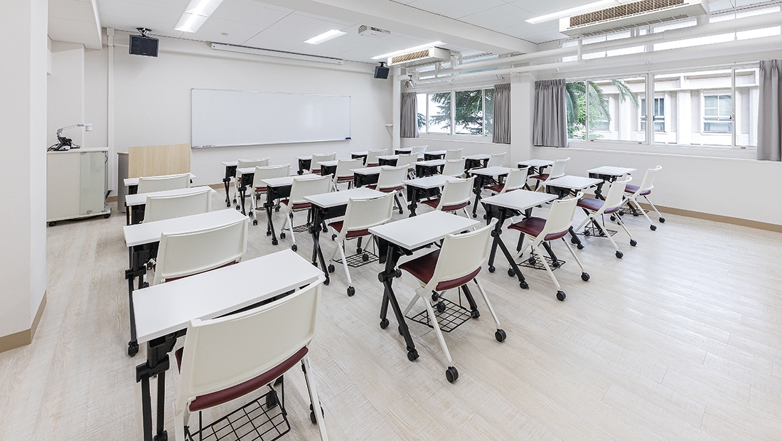 3号館 2階 326教室 ここラボ3/イス:ティーポ、デスク:フリプト、教師用イス:NR-CAW、教卓、ホワイトボード、AV設備、内装改修(壁、床、建具硬質塩ビシート貼り)