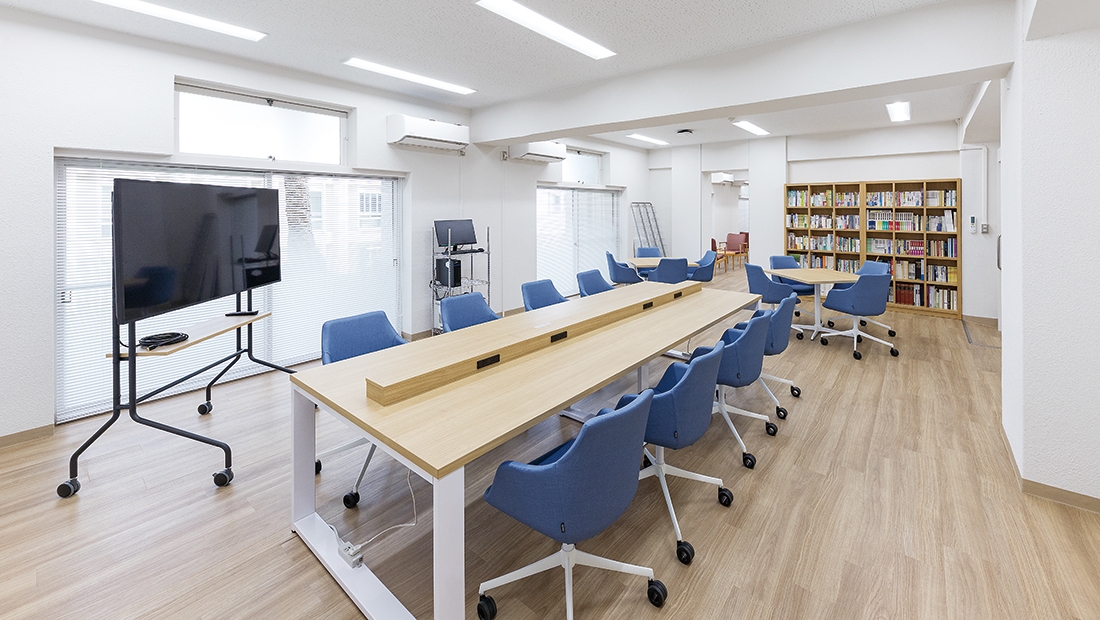 3号館 1階 コモンルーム/イス、テーブル、丸テーブル、ビッグテーブル、カウンターテーブル、カウンター、オープンシェルフ、モニタースタンド:PL-WF-MS65-N、AV設備、内装改修(壁、床、建具硬質塩ビシート貼り)