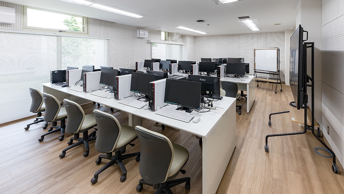 3号館 1階 310教室 AIワークステーション室/イス:AC-OA、デスク、ホワイトボード:PL-WF-WB0808、ホワイトボードスタンド:PL-WF-WS09、モニタースタンド:PL-WF-MS65-N、AV設備、内装改修(壁、床、建具硬質塩ビシート貼り)