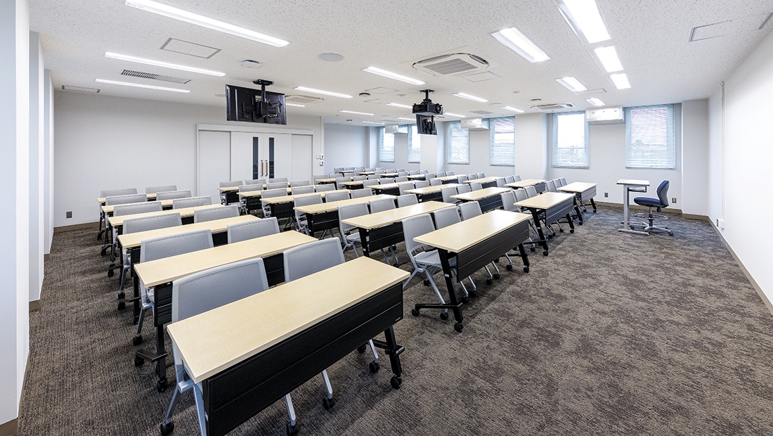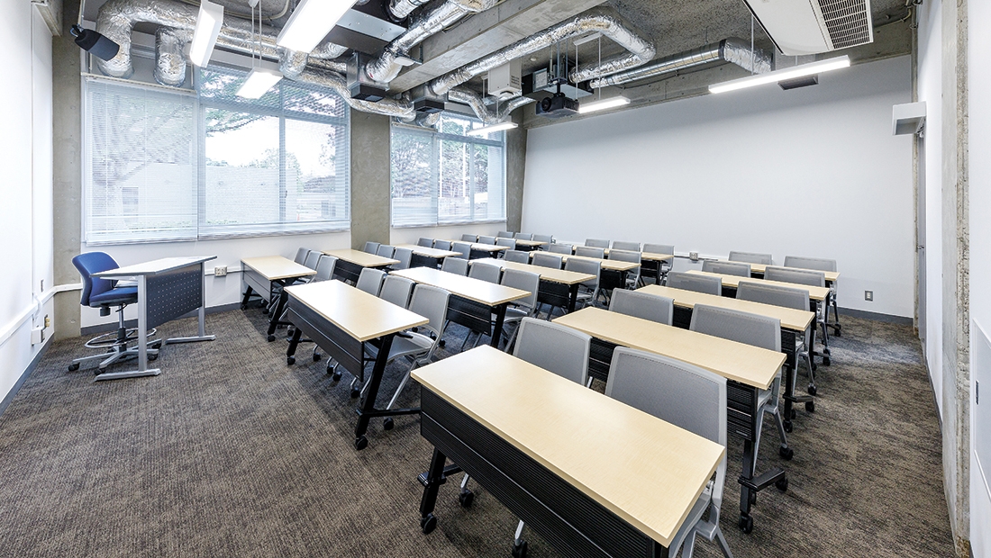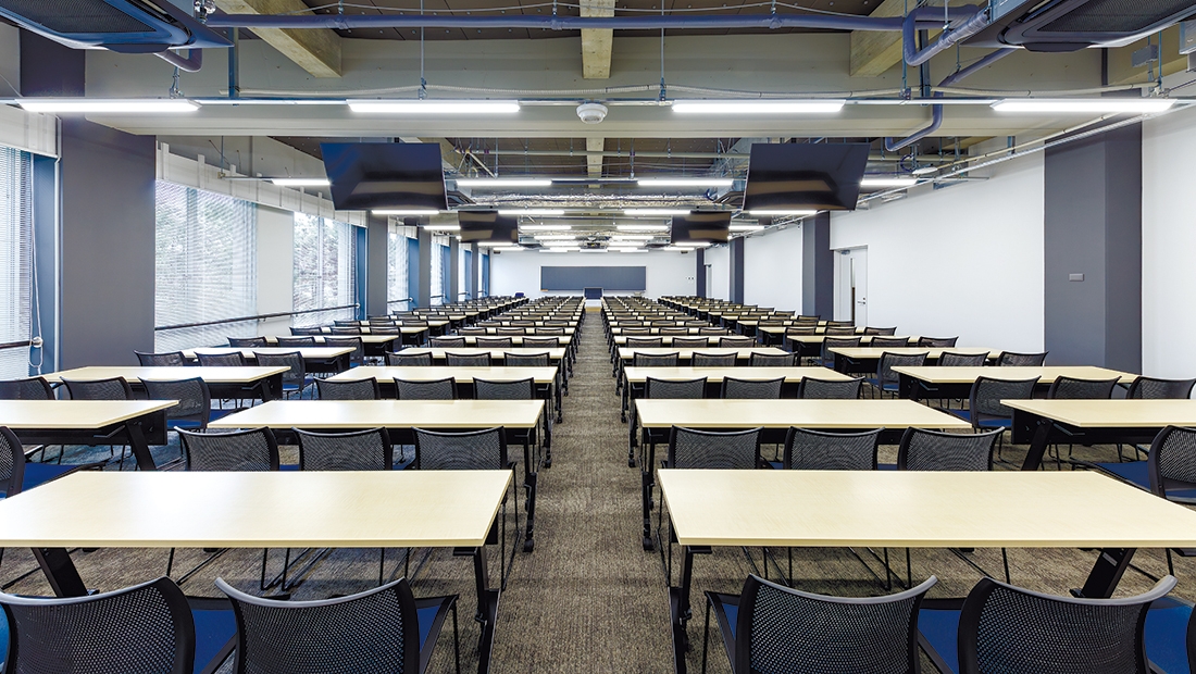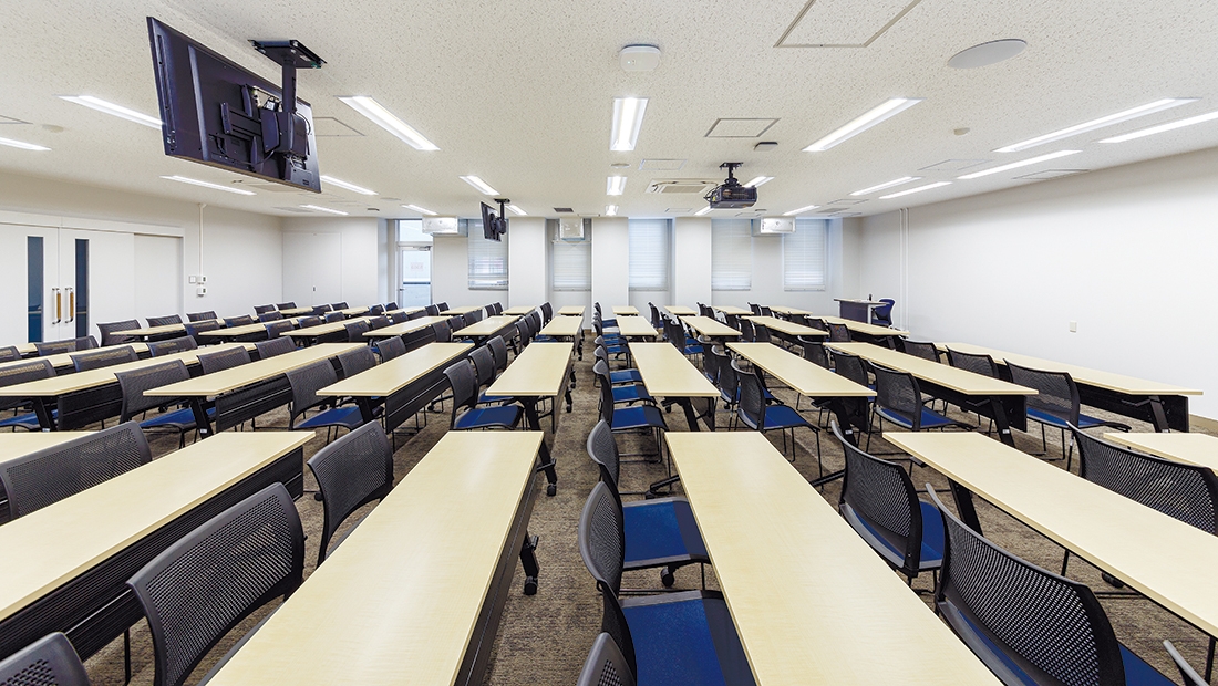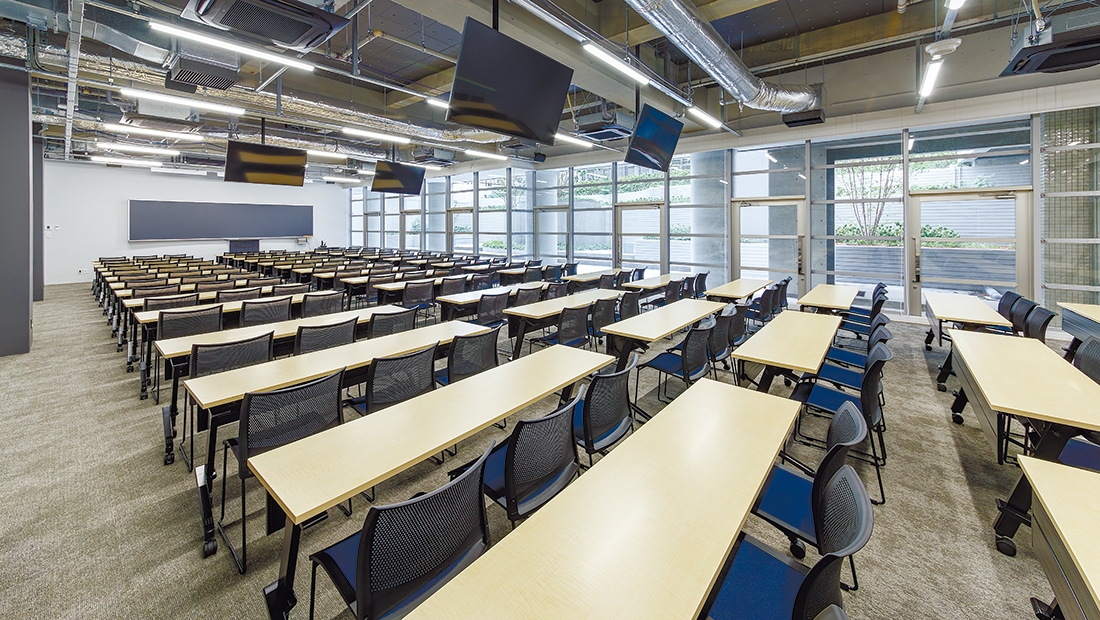 また、既存校舎である1号館の教室は、これまで図書館として利用していた建物を教室棟に改修し、最適な学習環境を実現。各教室には移動性に優れたイス・テーブルが採用され、講義とグループワークの双方ができるようになっているほか、アクティブラーニング室にはレイアウトを自在に変えられるイス・テーブルが採用され、少人数のグループワークやミーティングに活用できるようになっています。