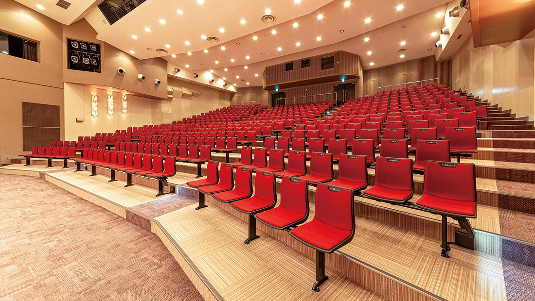 496名収容可能なプライマスメモリアルホールは、イベントや学校説明会など、さまざな用途で利用されています。入替えられた客席は、既存の客席の意匠を踏襲しながらも、背座パッド付きのイスが採用されており、より快適に聴講できるホールへと生まれ変わりました。