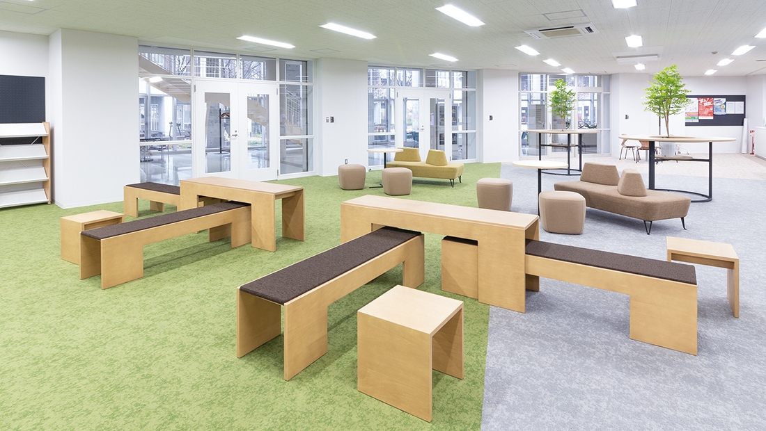 大同大学A棟で、事務機能の3階への移設に伴い、新たに1階に学生ホールを設置する改修が実施されました。