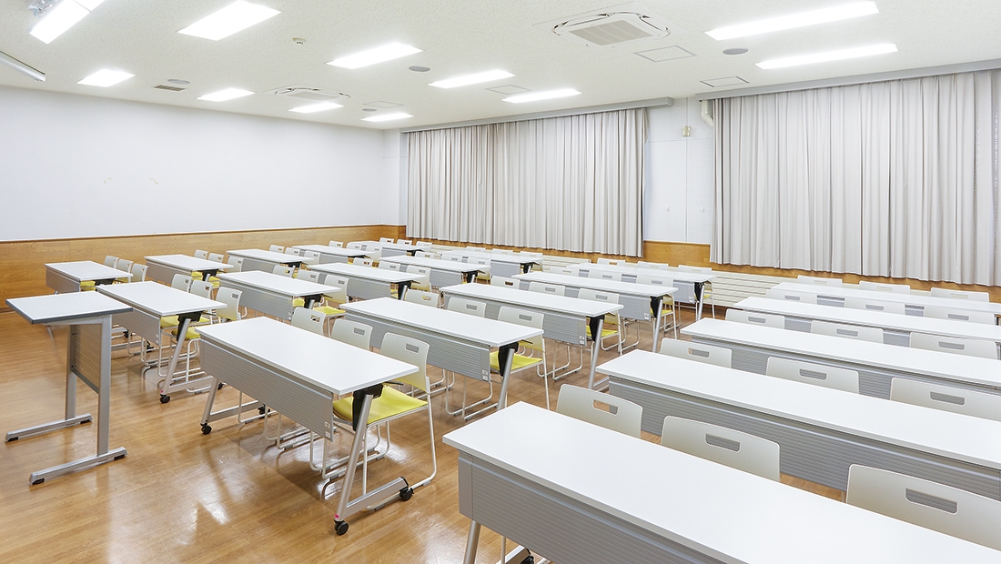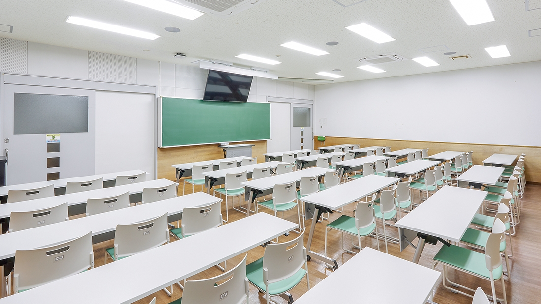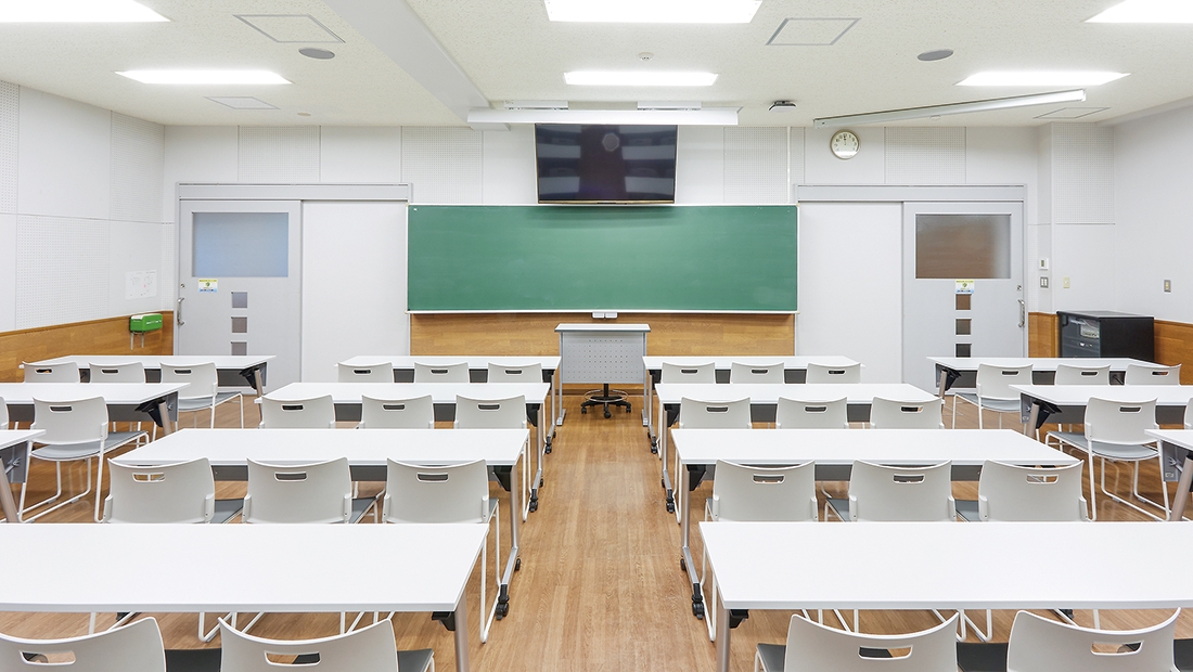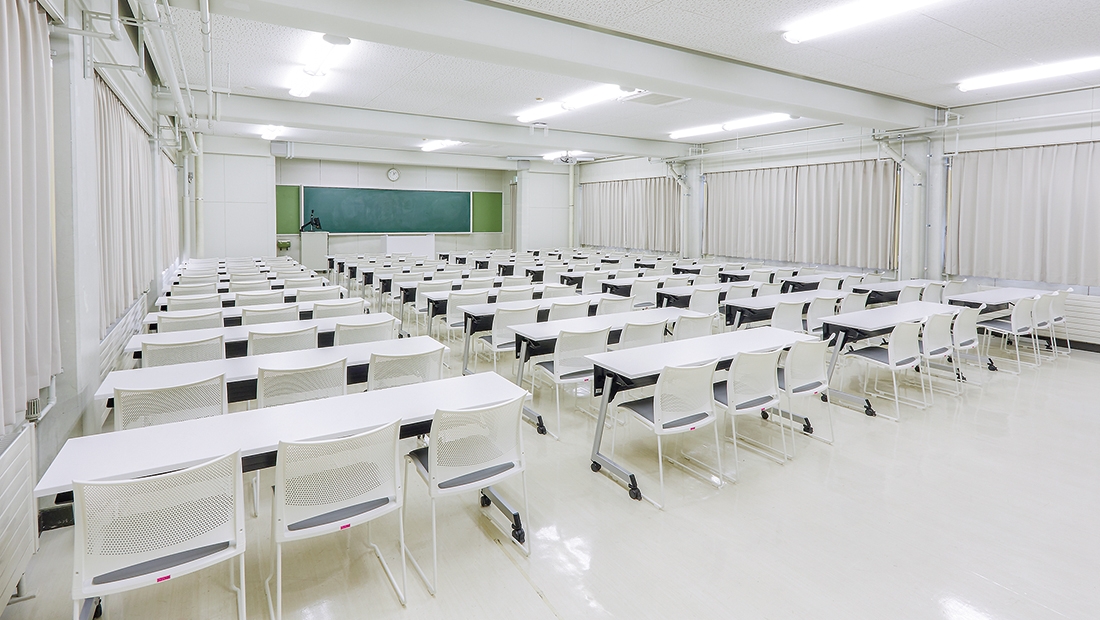 3号棟332教室の固定席は、これまでの木目基調から黒と白を基調としたイス・テーブルに入替えられたことにより、明るくモダンな空間へと生まれ変わりました。また、3号棟322教室の固定席は、前方通路タイプから後方通路タイプへと変更され、教室内のスムーズな移動が可能となったほか、移動席の各教室では、移動性と収納性が高いイス・テーブルが採用されており、フレキシブルにレイアウト変更ができるようになっています。