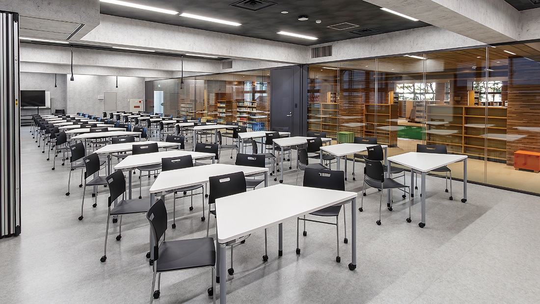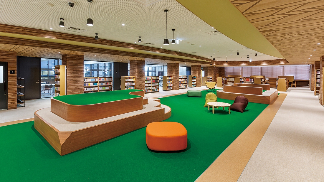 木を基調とした内装で温もりに溢れ、低い書架で見通しの良い開放感のある空間となった図書館には、中央に芝生広場のような「リラックススペース」が設けられたほか、読書や自習に集中できるスペースや多彩なメディアコンテンツを活用できるコーナーが設置されています。また、隣接して「アクティブラーニング」を実践する場として「ラーニングコモンズ」が設置されています。