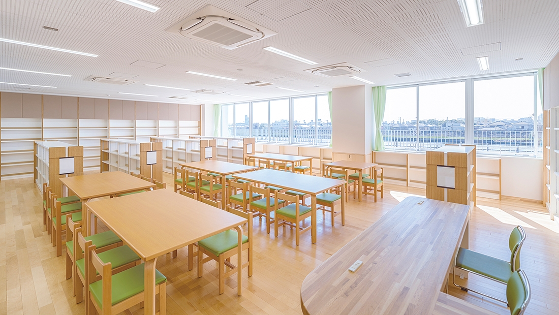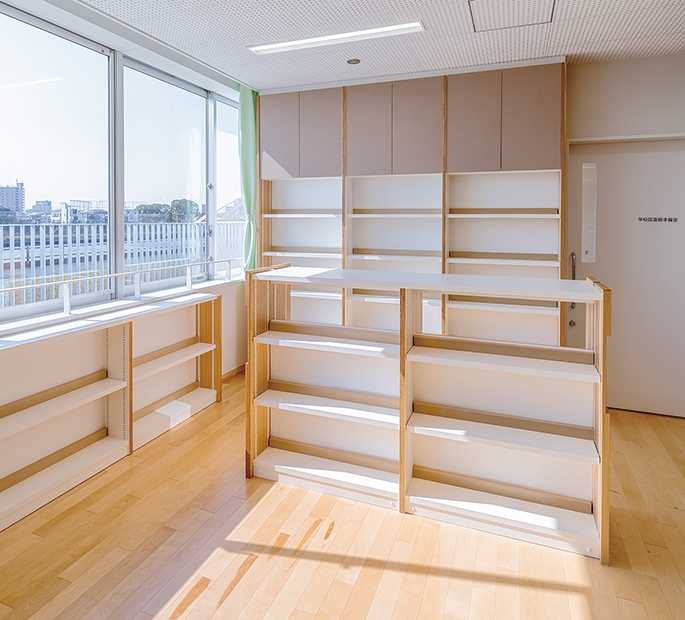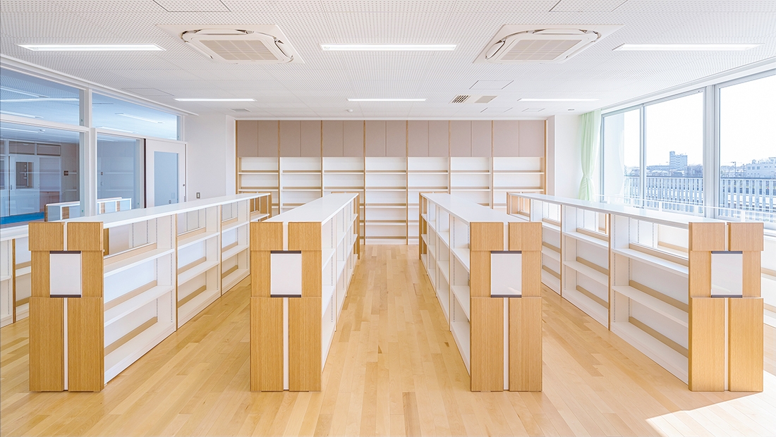 新校舎に設置された学校図書館(読書センター)には、木製の書架、イス・テーブルが設置されており、木の温もりが感じられる明るい空間となっています。