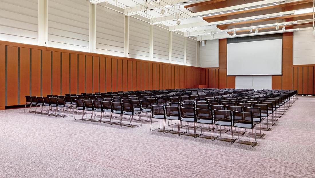 このたび、ホールのイス、テーブルの入替えが実施され、新たに採用された軽量で収納性が高いスタッキングチェア、移動性に優れたテーブルにより、従来よりレイアウト変更が容易となっています。