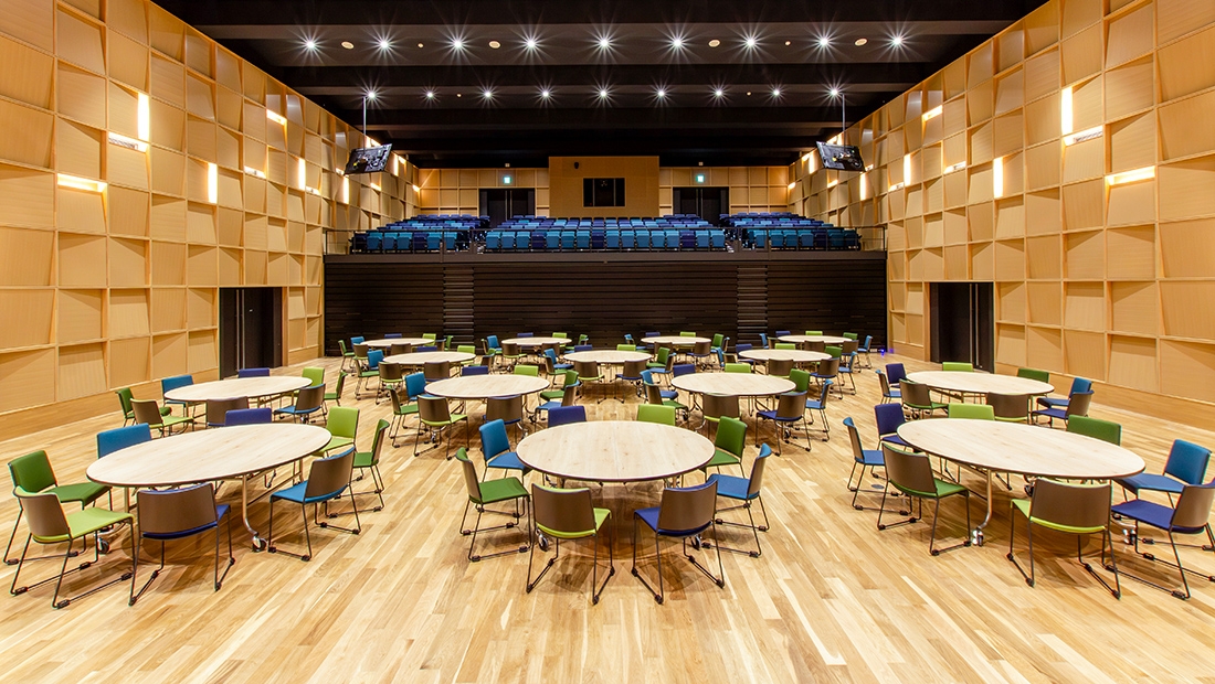 講堂/移動観覧席「テレスコープスタンド」:AHP-A8214-20P 390席、固定席:ATS-2014 210席 総席数 600席、イス:ジーン