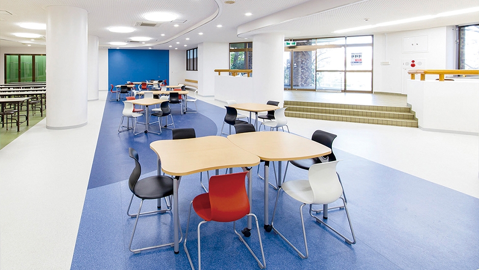 生徒ホール/イス:プロ、テーブル:DTN、内装改修(床、壁、照明、ショーケース)、一部移設家具