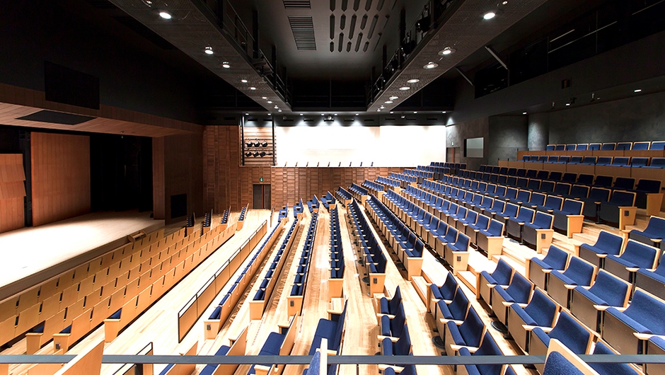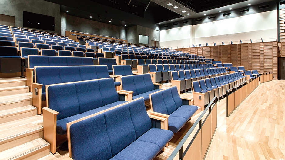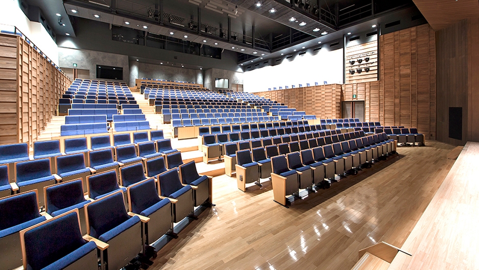 市民ホールは音楽観賞を主とした空間づくりがなされており、客席の賑わい感を演出するサイドバルコニー席や、客席中ほどには、肘掛けで仕切られていない、グループでの観賞に特化したボックス席が設けられています。